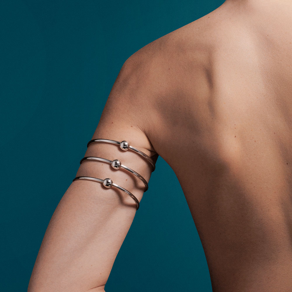 Браслет на предплечье Pianegonda из коллекции Assoluto выполнен из серебра 925 пробы с тремя сферами и гальваническим покрытием родием. Браслет Assoluto вдохновлён феноменом электричества, которое в древнегреческой мифологии ассоциировалось с богиней Электрой.