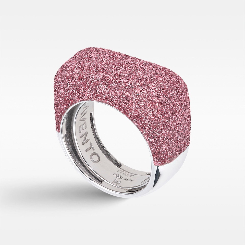 Кольцо Pesavento из коллекции Polvere di Sogni в геометрическом объемном дизайне из серебра покрытого родием и эмалью в цвете Dark Pink с микрочастицами, полученными с помощью нанотехнологий из натуральных минеральных материалов.